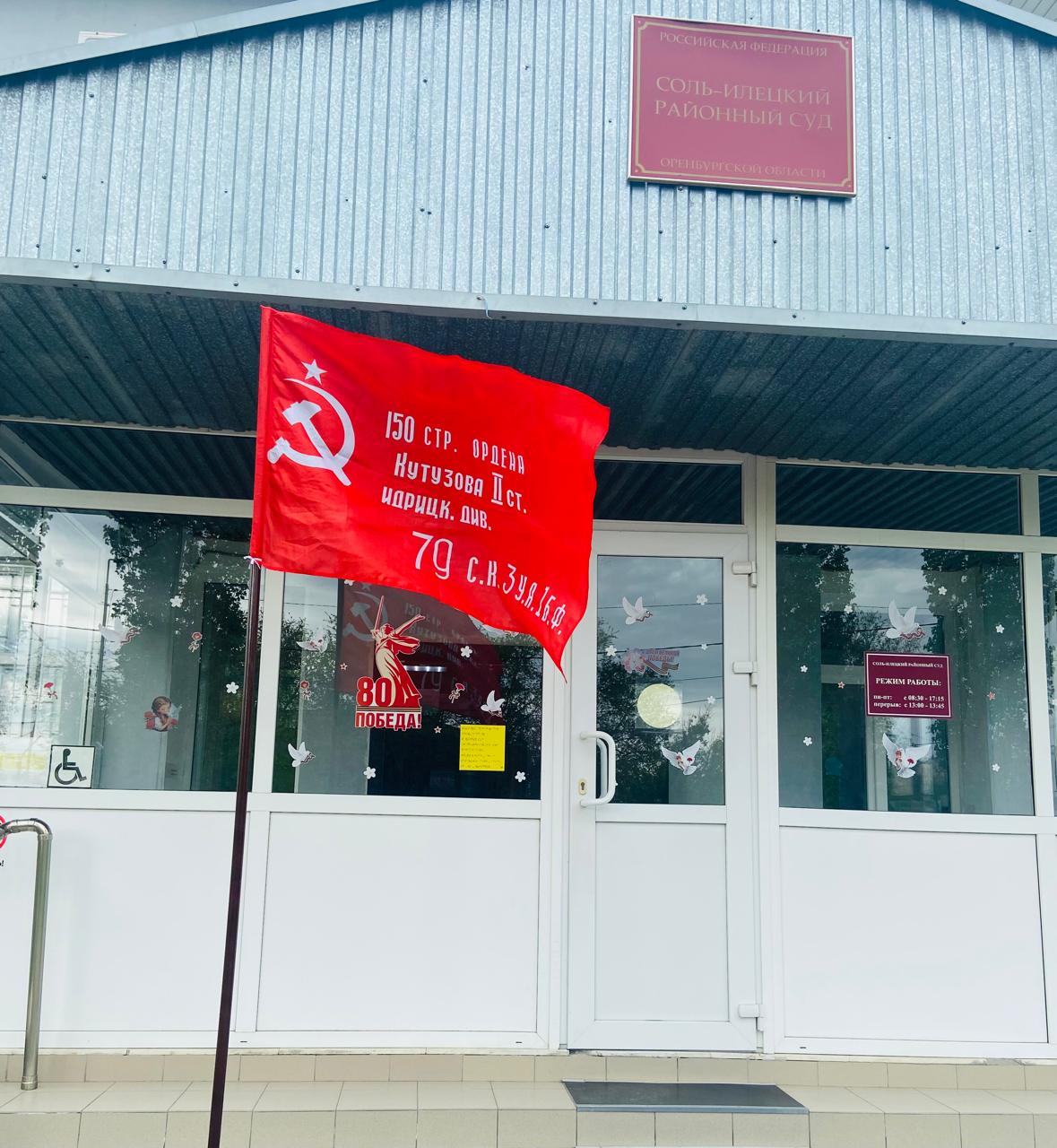 В преддверии празднования 80-летия Великой Победы на фасаде здания Соль-Илецкого районного суда Оренбургской области установлена копия Знамени Победы.
